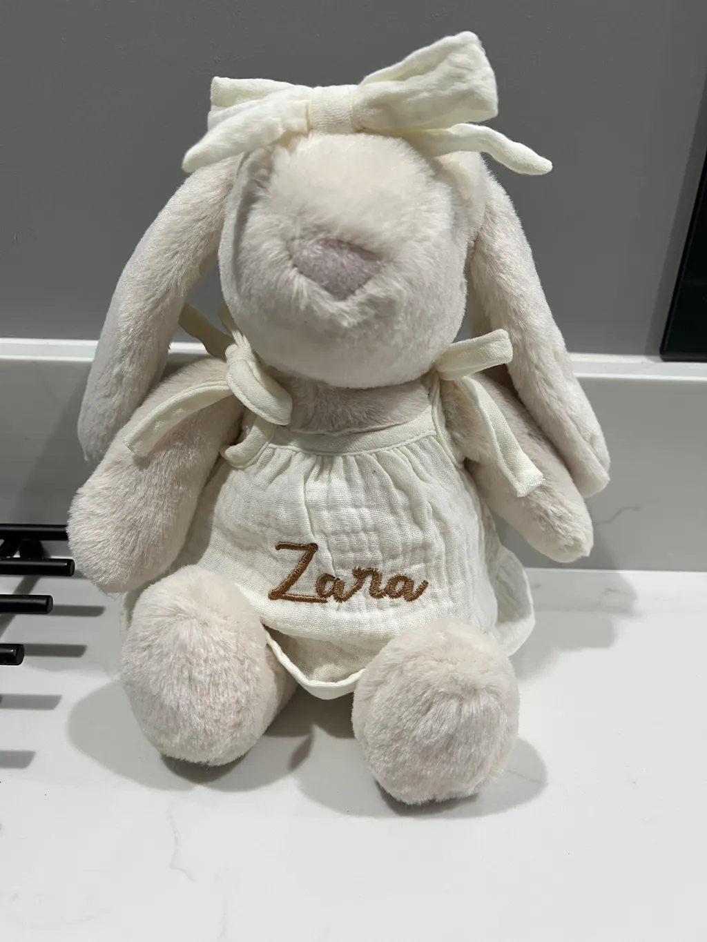 Make Snuggle Bunny truly special by choosing her outfit – will she be dressed in cute dungarees or one of our adorable tiny dresses? Add your personal touch by having her outfit embroidered with your child’s name, nickname, or initials – a keepsake they’ll cherish forever.
