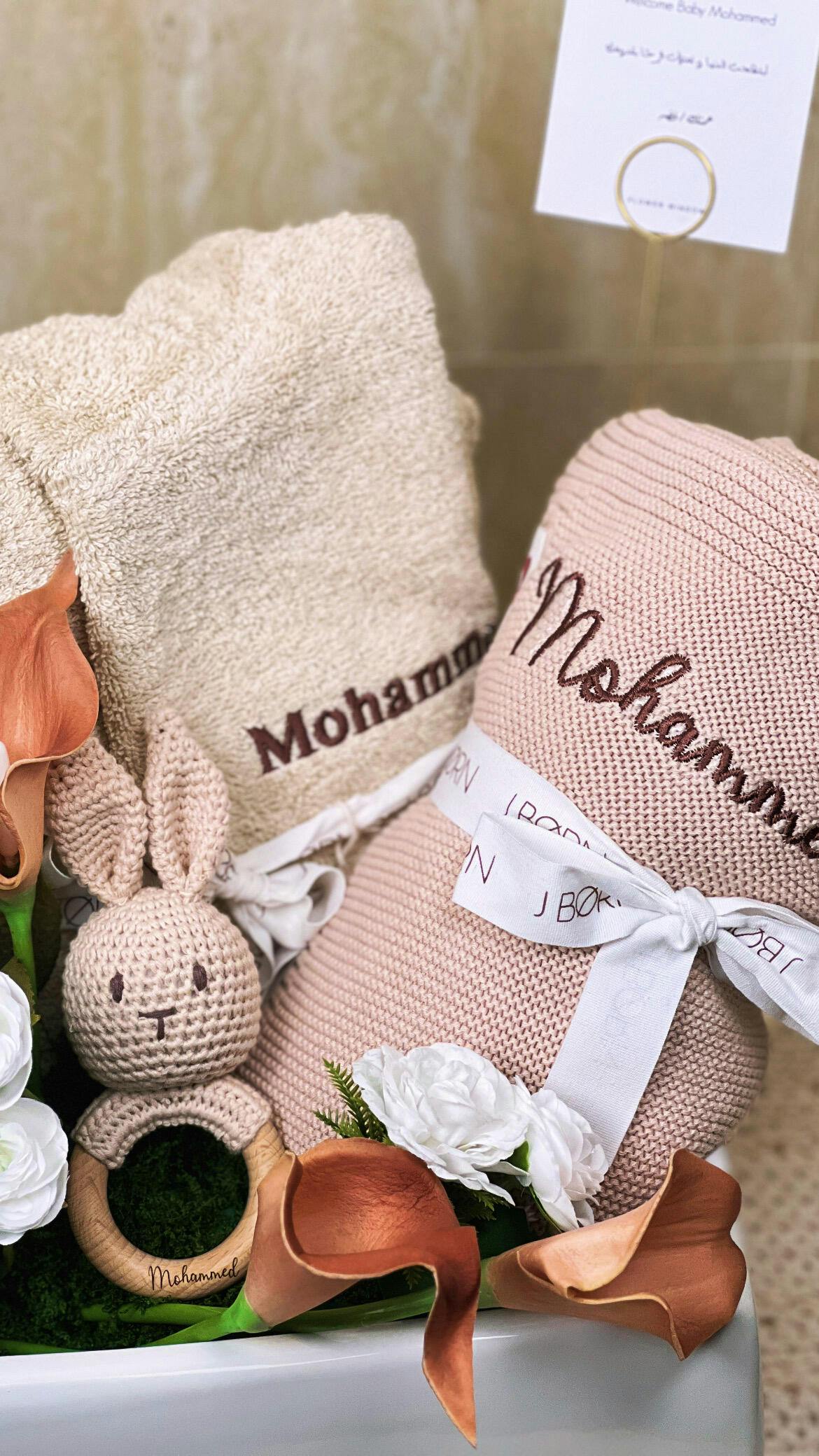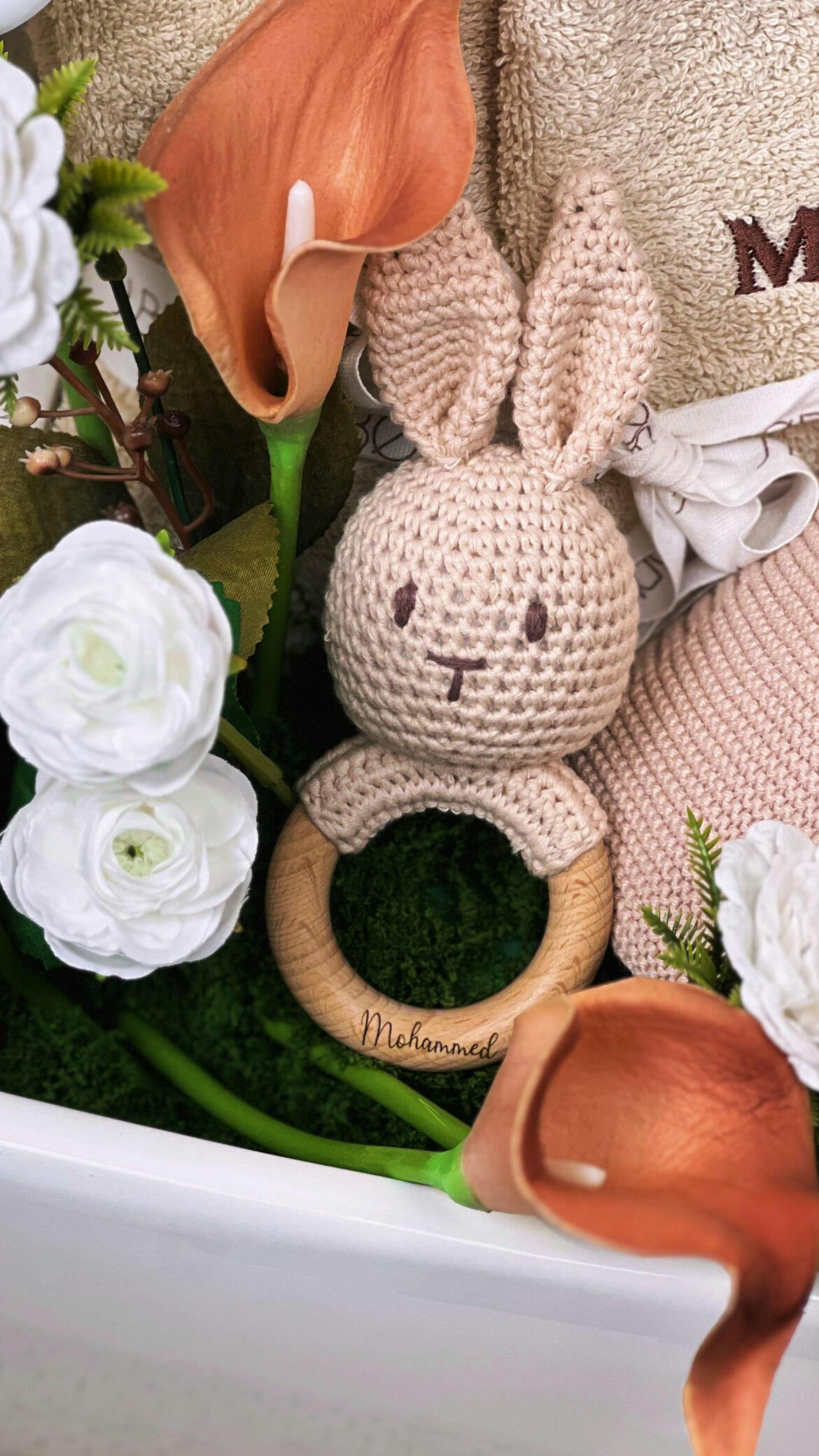 Discover the perfect expression of love and warmth with our exclusive gift set, featuring a beautifully crocheted rattle bunny toy and a soft knitted blanket in beautiful Ivory colours. Rattle bunny toy is delicately engraved with the baby's name, adding a personal touch that is sure to be cherished.
