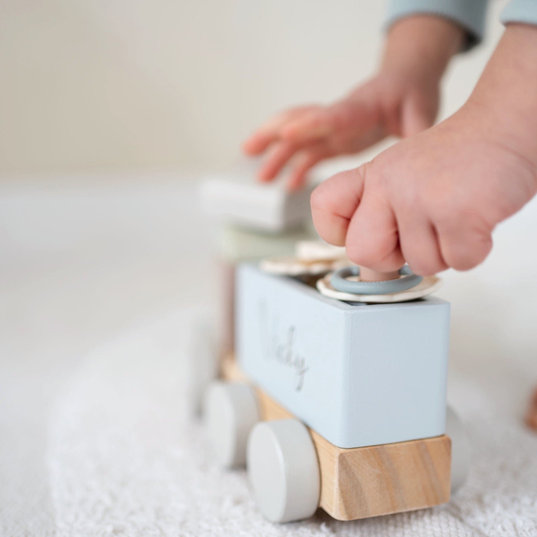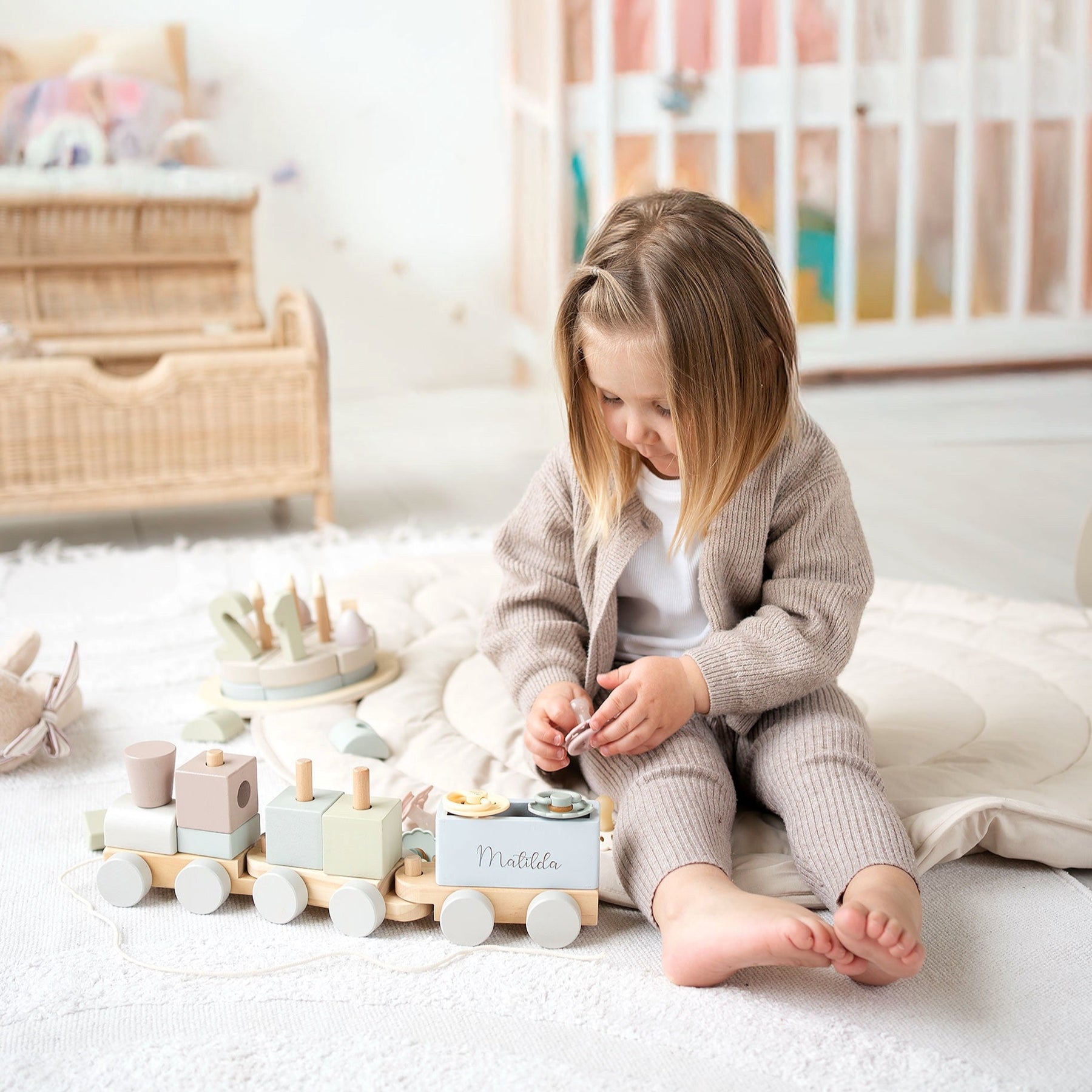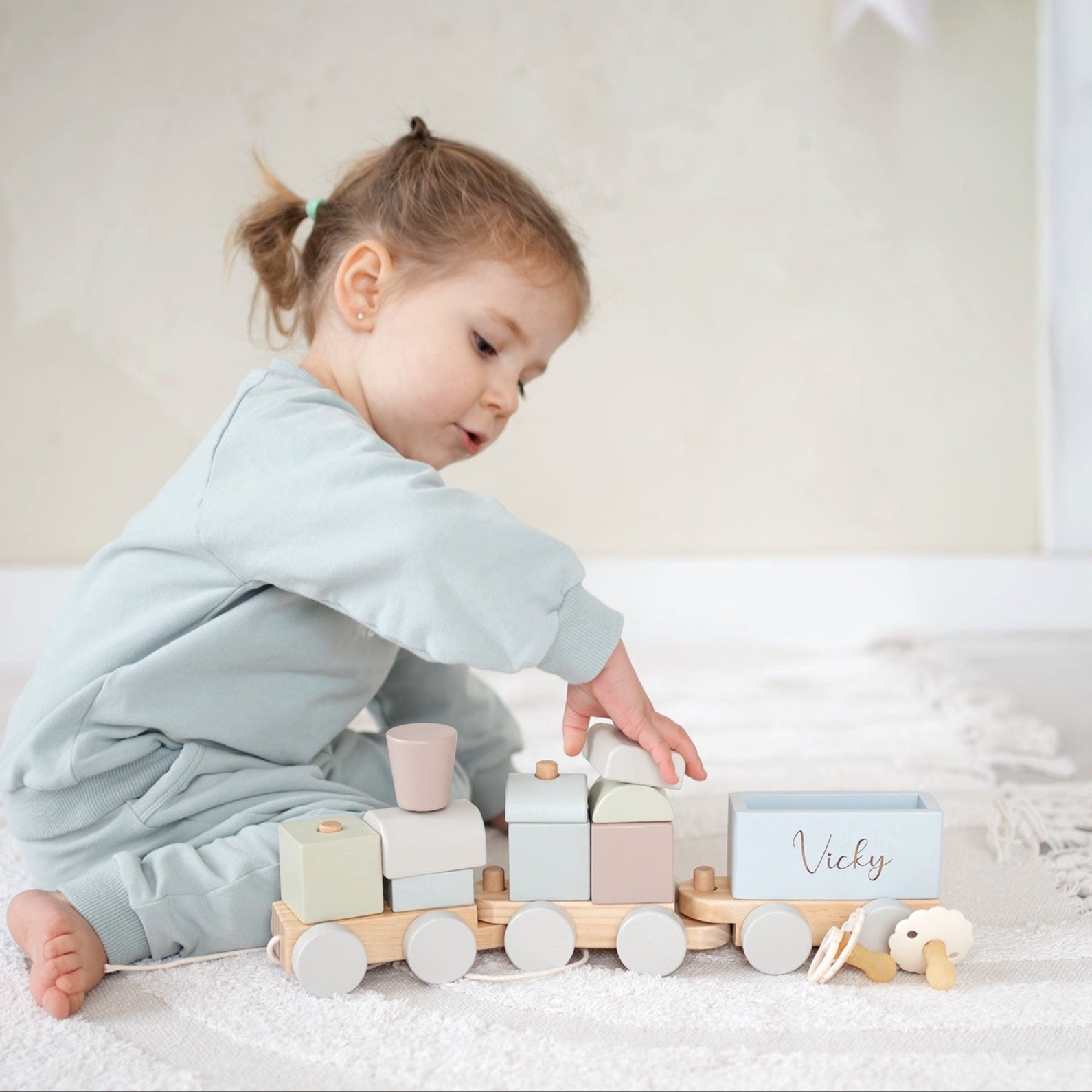 All aboard for fun and imagination with the our new Wooden Blocks Train Set! Handcrafted from FSC-certified wood and painted in soft pastel colours, this beautiful train is as delightful to play with as it is to display in a nursery or playroom.