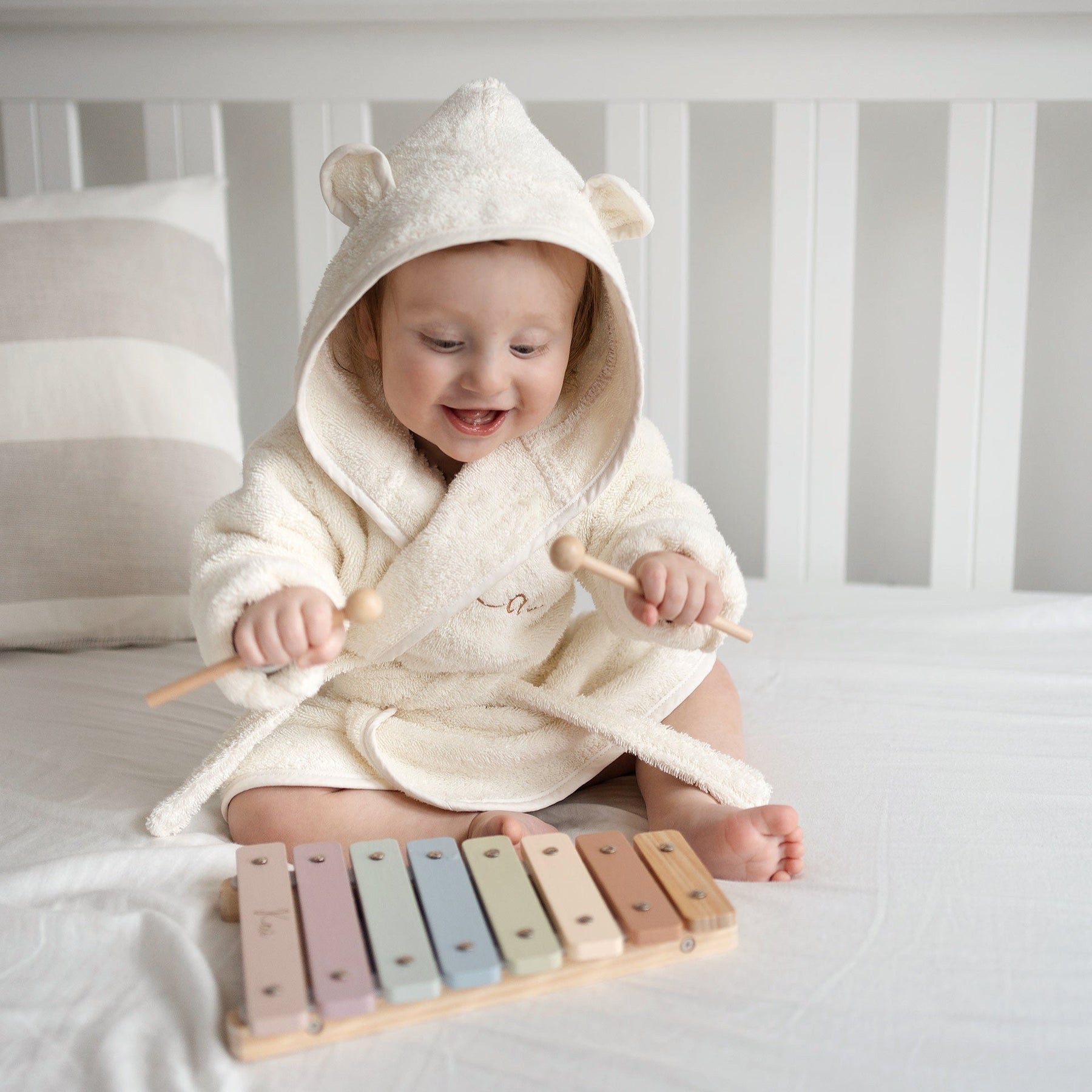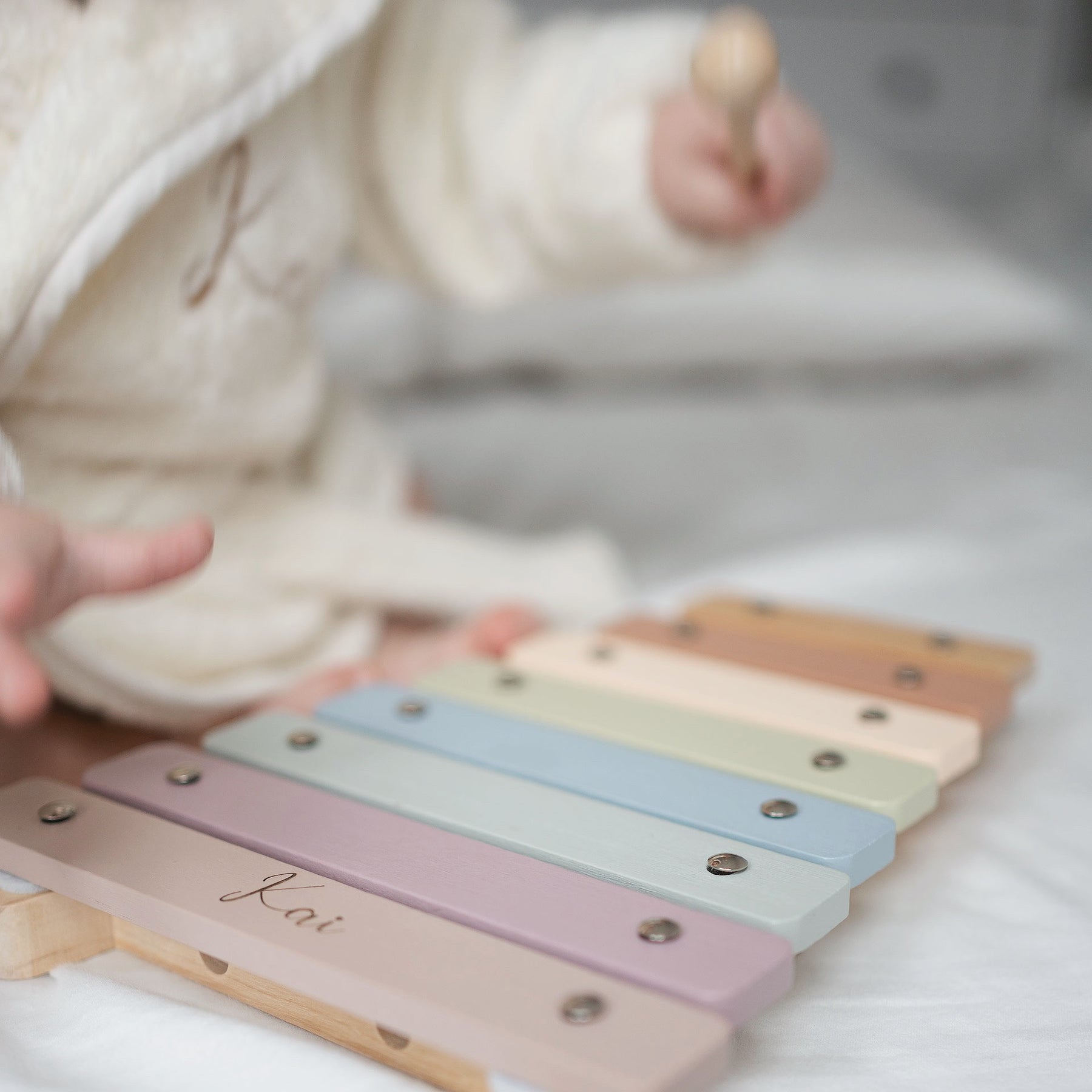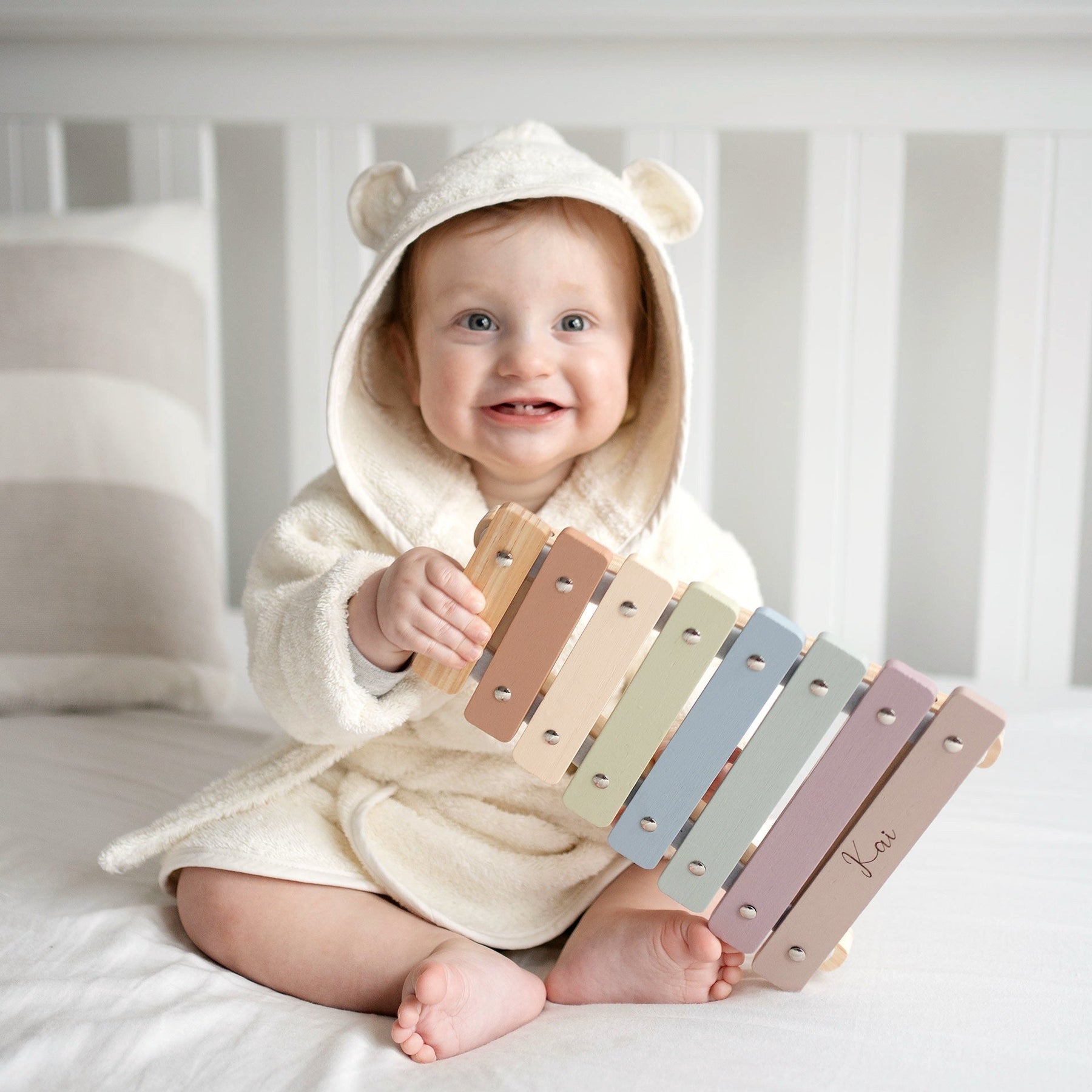 Perfect for birthdays, baby showers, or as a timeless nursery accessory, our xylophone combines playful learning, sustainability, and a personal touch.