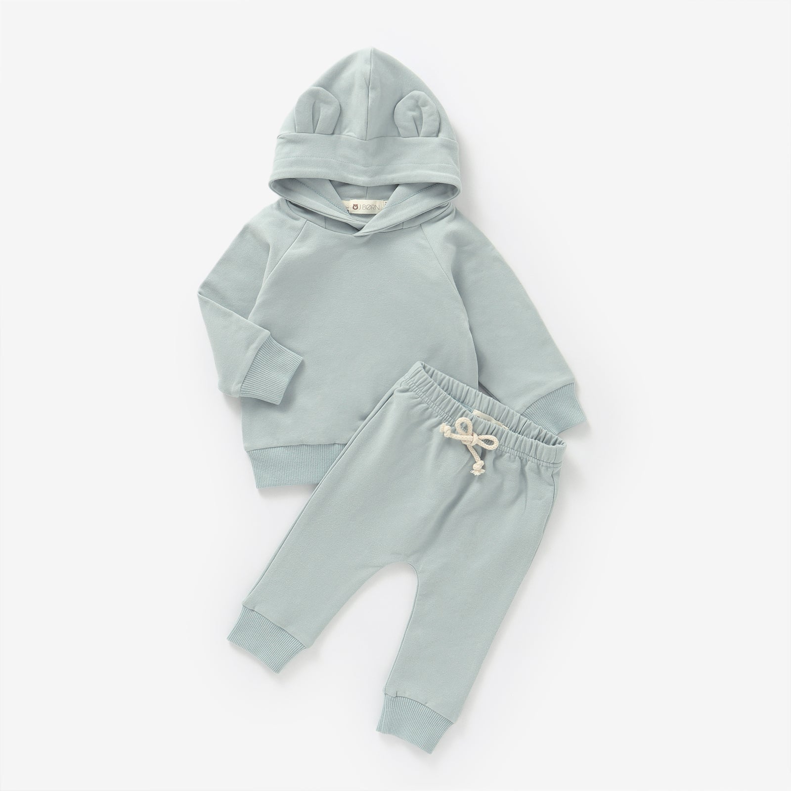 JBØRN Organic Cotton Baby Teddy Ears Hoodie & Joggers Set | Personalisable Stone Blue - Personalisable Baby Products Sold and Personalised by JustBørn
