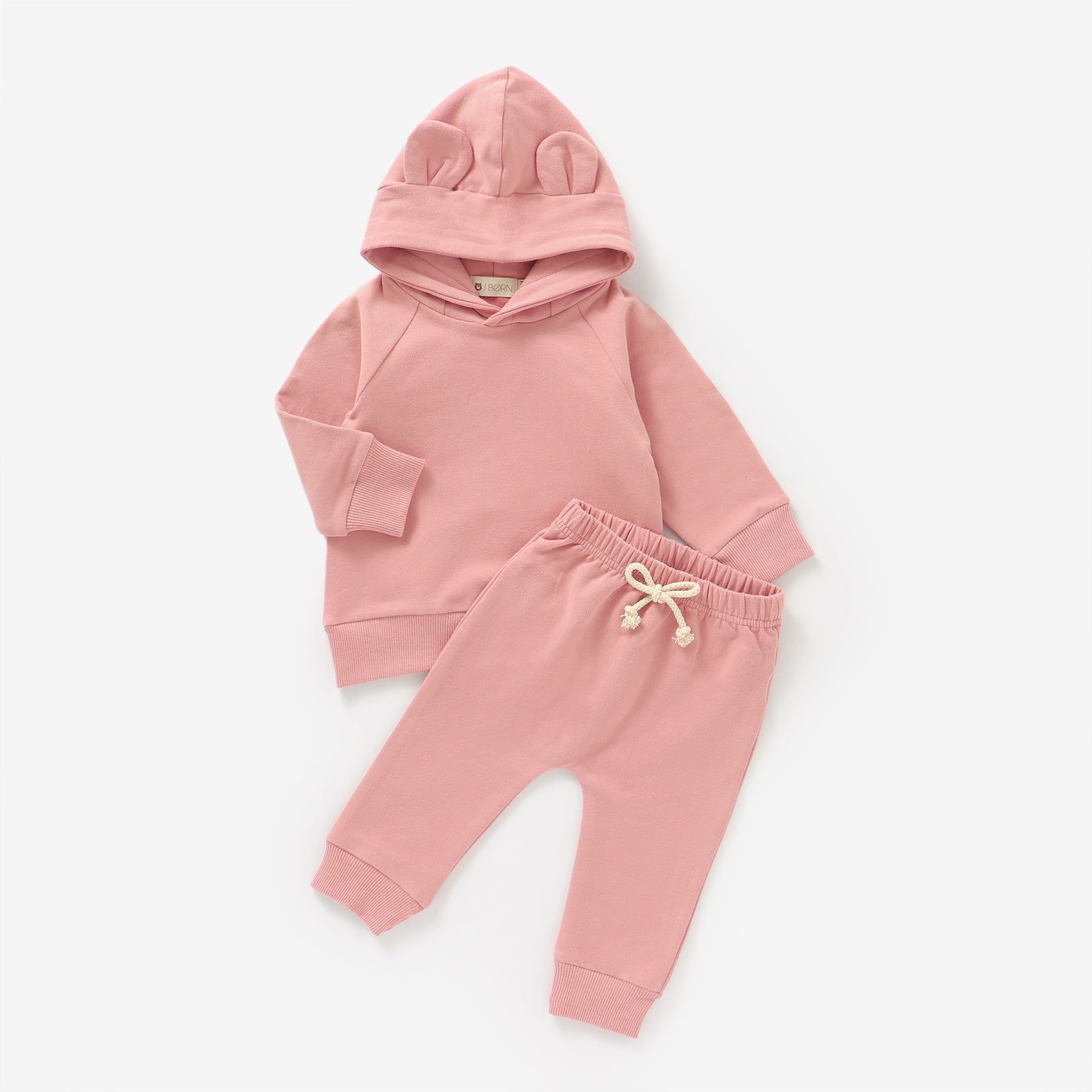 JBØRN Organic Cotton Baby Teddy Ears Hoodie & Joggers Set | Personalisable Powder Blush - Personalisable Baby Products Sold and Personalised by JustBørn