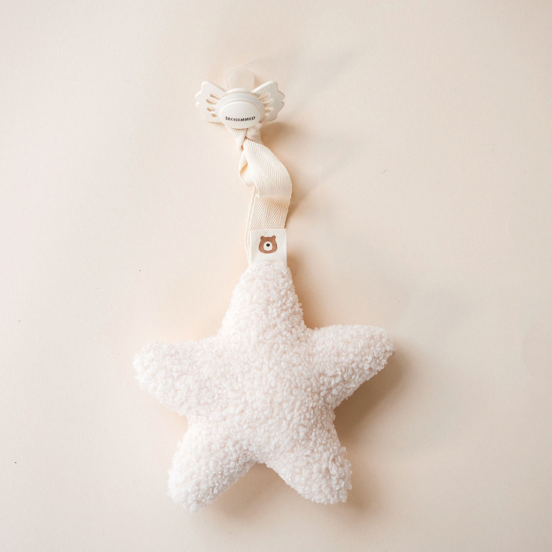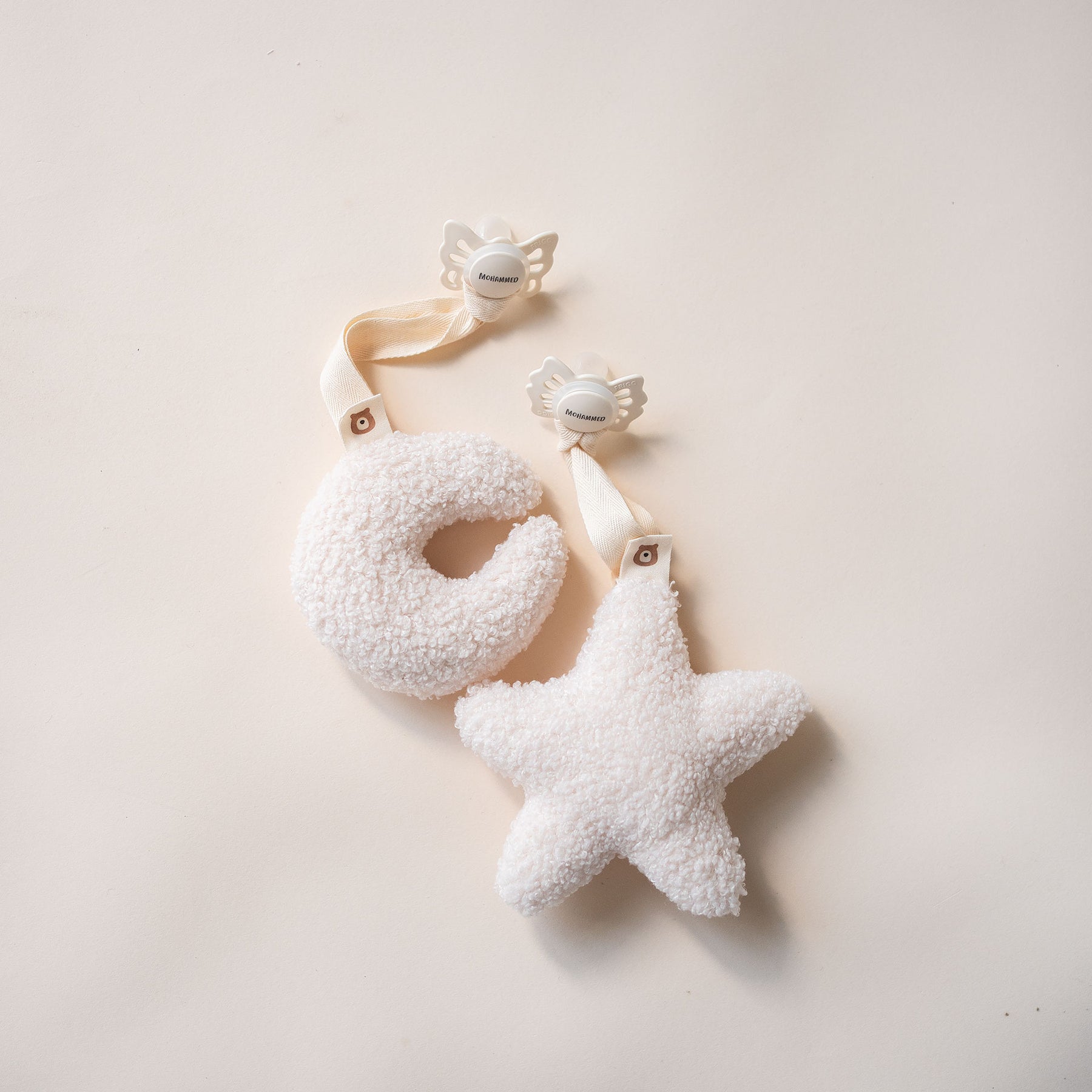 Welcome your little one with our beautifully curated FRIGG Baby’s First Pacifier Pack, paired with a handmade personalised JBØRN pacifier clip and a soft plush comforter with pacifier loop — the perfect newborn gift.