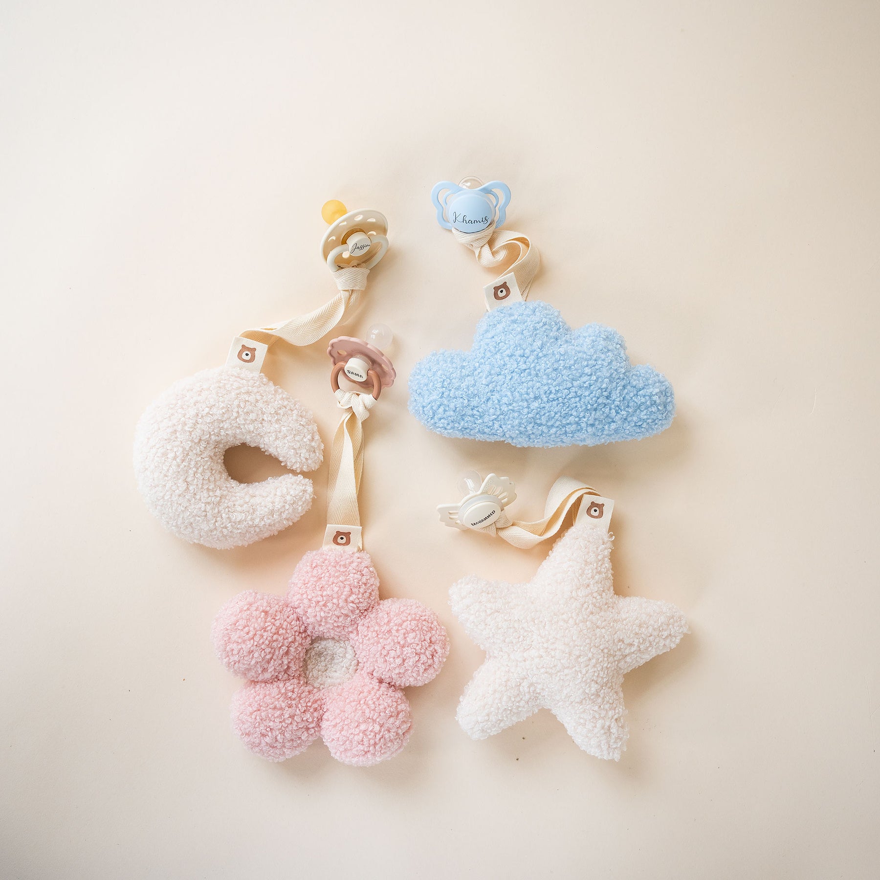 Thoughtfully designed to help parents discover which shape and material baby prefers, while keeping dummies safe, close and beautifully coordinated.