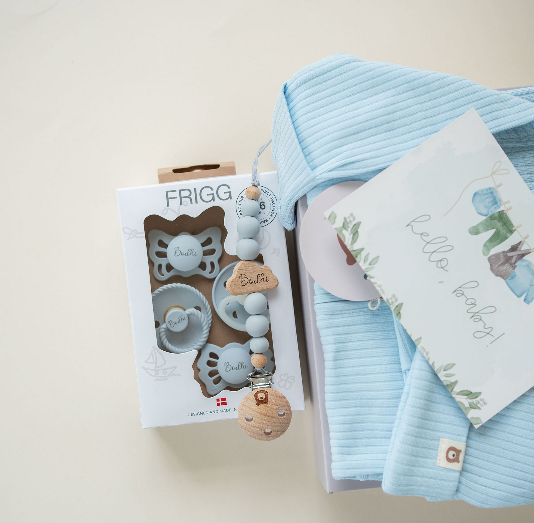 Includes premium Danish-designed FRIGG pacifiers, each expertly engraved with your baby’s name for that special personal touch. -