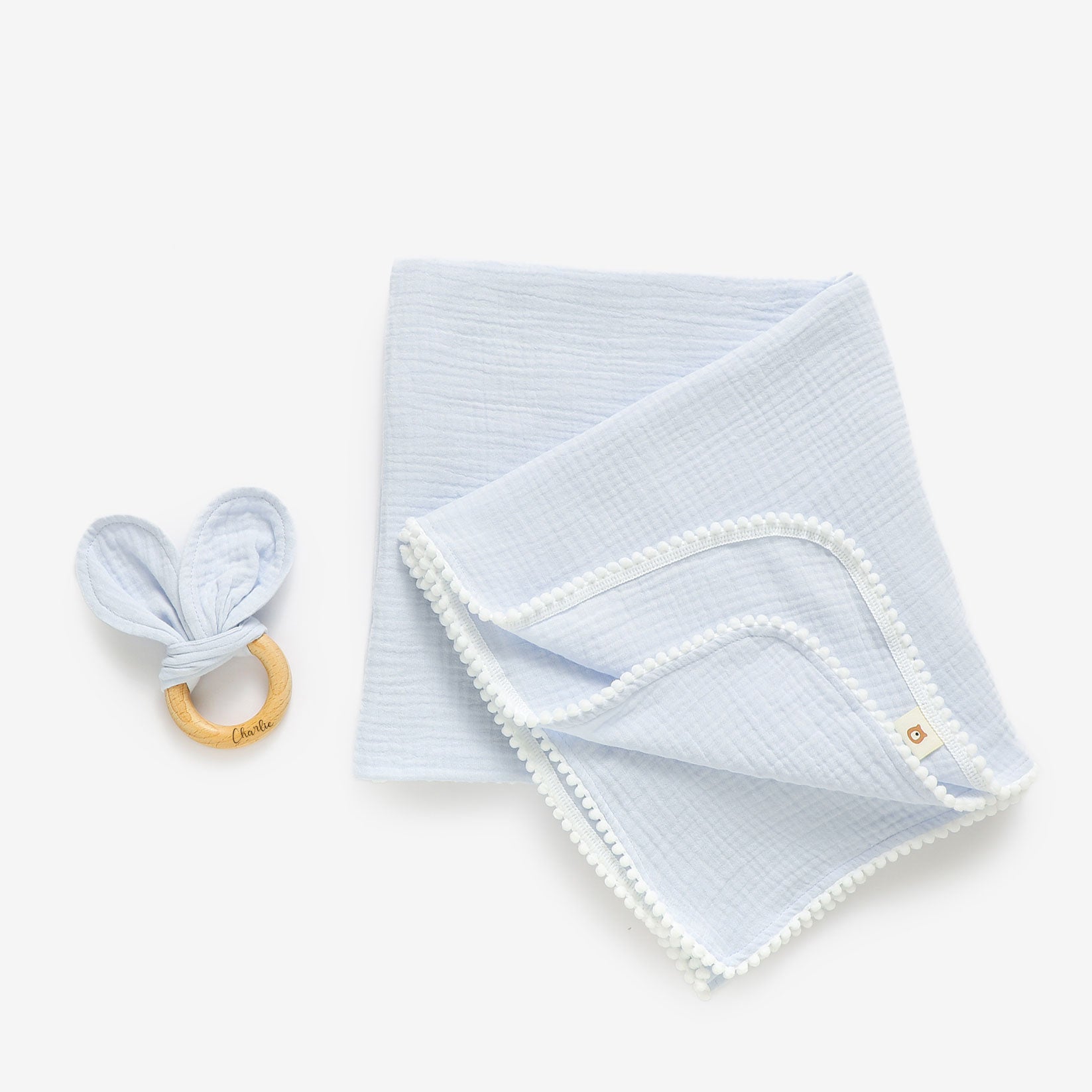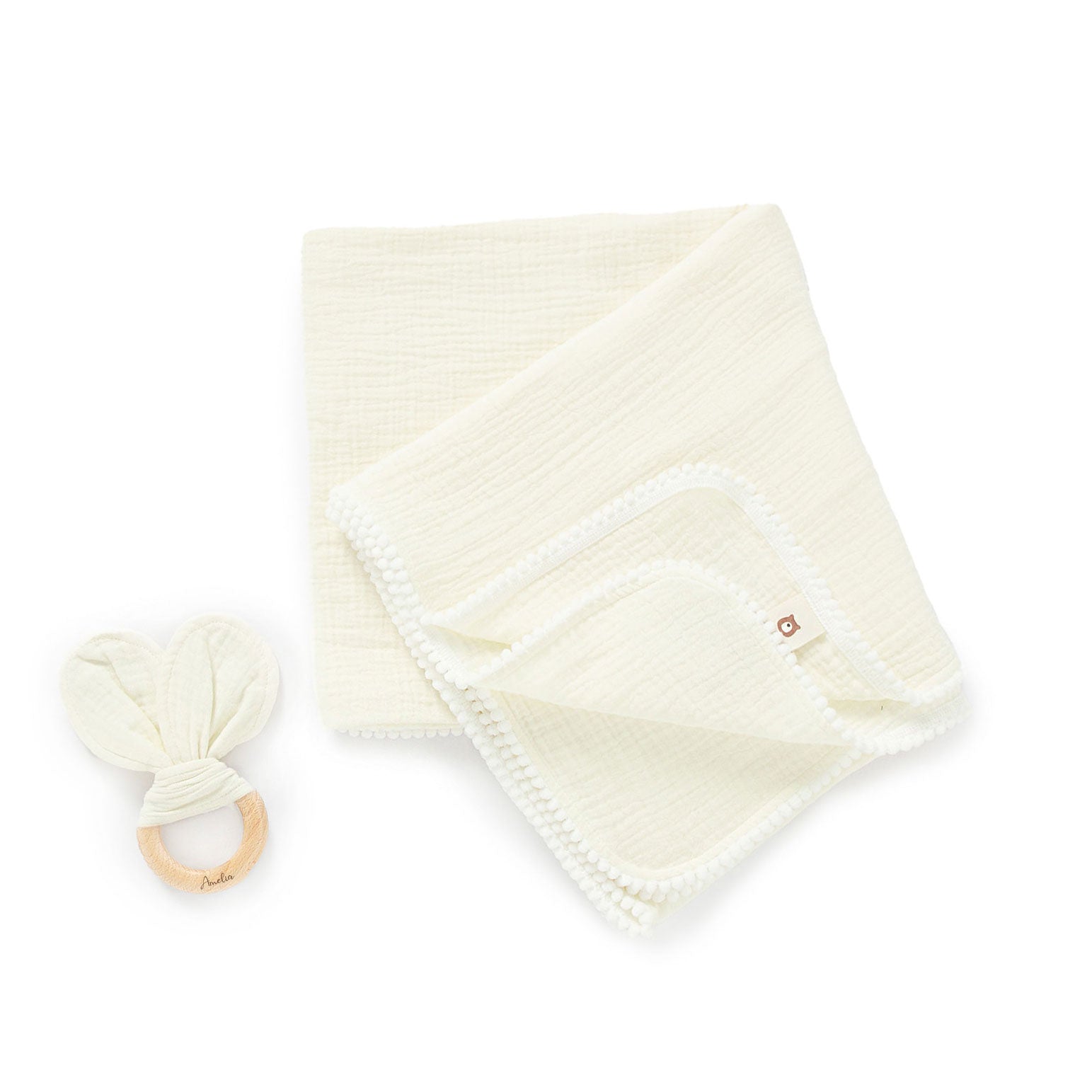 JBørn's matching set of a muslin blanket & teether. We use 100% Super Soft Organic Cotton for the muslin blanket and teether ears, along with sanded-down beech wood which is naturally antibacterial.